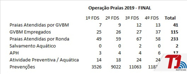Ao todo, 41 praias foram atendidas, contando com o emprego de 115 bombeiros militares de forma direta. A corporação ainda atendeu outras 233 praias com o serviço de fiscalização e executou 80 atividades preventivas, ou seja, cada vez que uma guarnição de guarda-vidas atuou numa praia.