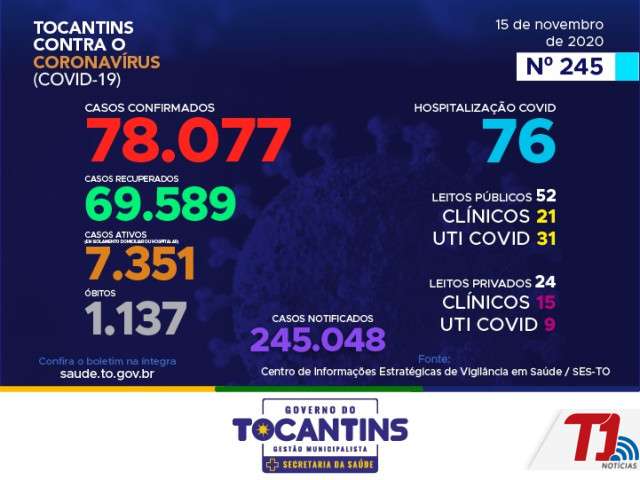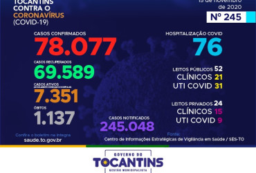 Desta forma, hoje o estado soma 245.048 pessoas notificadas com a Covid-19 e acumula 78.077 casos confirmados. Destes, 69.589 pacientes estão recuperados 7.351 pacientes seguem em isolamento domiciliar ou hospitalar e 1.137 pacientes foram a óbito.