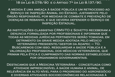 O Conselho Regional de Medicina Veterinária do Tocantins (CRMV) e a Sociedade dos Médicos Veterinários do Estado do Tocantins (Sovetto) emitiram, em conjunto, uma nota de repúdio, nesta terça-feira, 24, contra um ofício assinado pelo presidente da Adapec, Alberto Mendes Rocha, autorizando um frigorífico de Palmeirópolis abater bovinos sem que o produto passasse pelo processo de resfriamento, já que a câmara fria do estabelecimento estava sem funcionar.