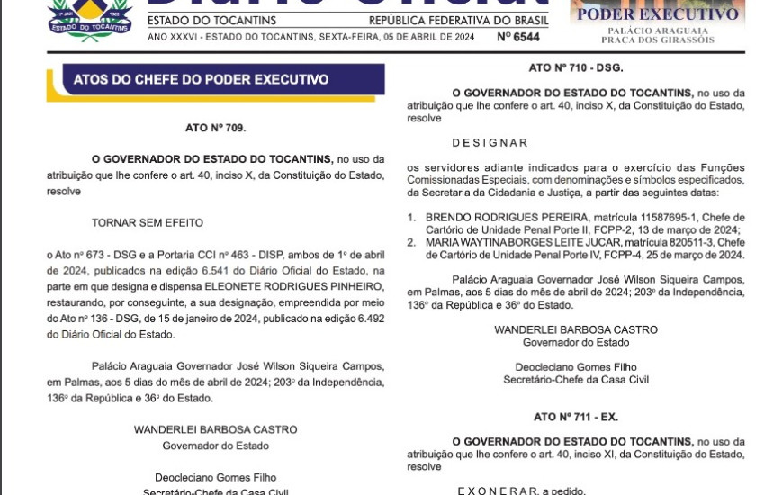 O Governo do Tocantins, por meio do Diário Oficial do Estado desta sexta-feira, 5, também anunciou algumas alterações no corpo administrativo do Estado. O executivo exonerou, a pedido, Edson Mota de Oliveira, que ocupava o cargo de secretário executivo da Governadoria. Wellington Ferreira de Medeiros, que respondia ao cargo de secretário Extraordinário de Políticas de Governo Descentralizadas, da também da pasta da Governadoria, foi exonerado. Lúcio Campelo, que atuava como assessor da governadoria e já havia deixado seu cargo, agora é pré-candidato a vereador de Palmas pelo PL.