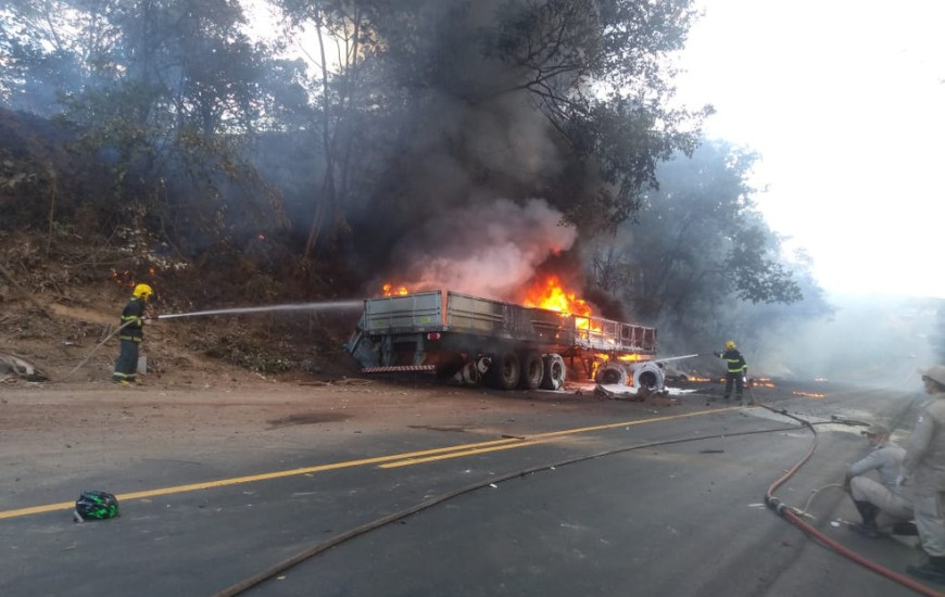 Equipes do Corpo de Bombeiros trabalharam no controle do incêndio e impediram que o fogo se alastrasse para a Serra do Estrondo. O motorista da carreta envolvido no acidente não foi localizado.