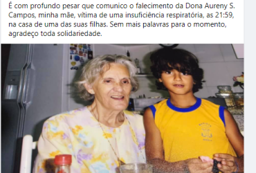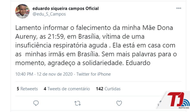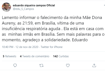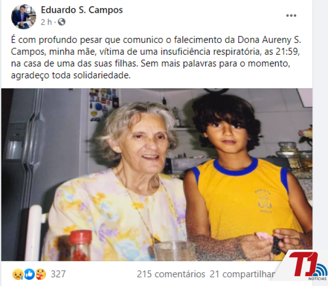 “É com profundo pesar que comunico o falecimento da Dona Aureny S. Campos, minha mãe, vítima de uma insuficiência respiratória, às 21:59, na casa de uma das suas filhas. Sem mais palavras para o momento, agradeço toda solidariedade”, lastimou Eduardo na publicação.