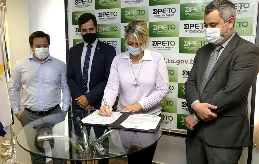 A assinatura do contrato por parte da Defensoria Pública foi realizada na tarde desta segunda-feira, 13, na sede da Instituição, em Palmas. Prestigiaram o subdefensor público-geral Pedro Alexandre Conceição Aires Gonçalvez; o superintendente de defensores públicos Danilo Frasseto Michelini; e o presidente da Associação das Defensoras e Defensores Públicos do Estado do Tocantins, Guilherme Ivo Vilela.