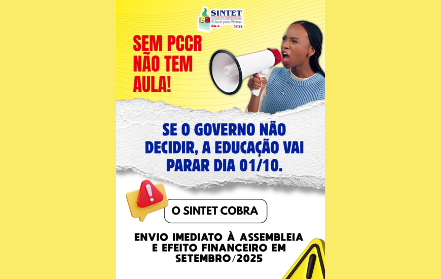 O Sindicato dos Trabalhadores em Educação no Estado do Tocantins (Sintet) decidiu que poderá paralisar as atividades na próxima quarta-feira, 1º, caso o governo não defina uma data para o envio do Plano de Cargos, Carreiras e Remuneração (PCCR) da categoria à Assembleia Legislativa. A deliberação ocorreu na última quinta-feira, 25.