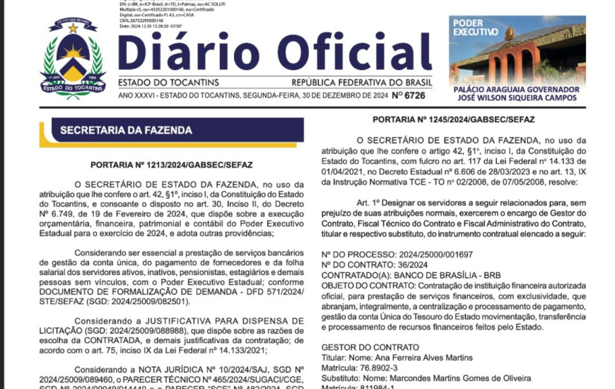 Em portaria publicada na edição nº 6726 do Diário Oficial do Estado, o Governo do Tocantins formalizou a contratação do Banco de Brasília (BRB) como responsável exclusivo pela prestação de serviços financeiros. A medida envolve a centralização e processamento de pagamentos, além da gestão da conta única do Tesouro Estadual. O contrato foi assinado no dia 30 de dezembro, com vigência de cinco anos (60 meses).