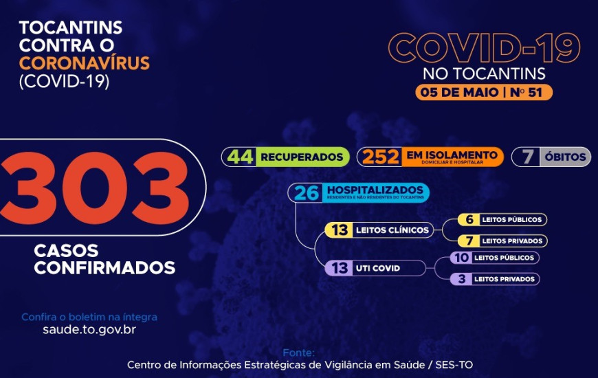 Atualmente, o Tocantins apresenta 303 casos no total, destes, 07 pacientes foram a óbito, 44 pacientes estão recuperados e 252 pacientes estão ainda em isolamento domiciliar ou hospitalar. O Estado possui uma plataforma onde todos podem acompanhar os números da Covid-19 no Tocantins: http://coronavirus.to.gov.br