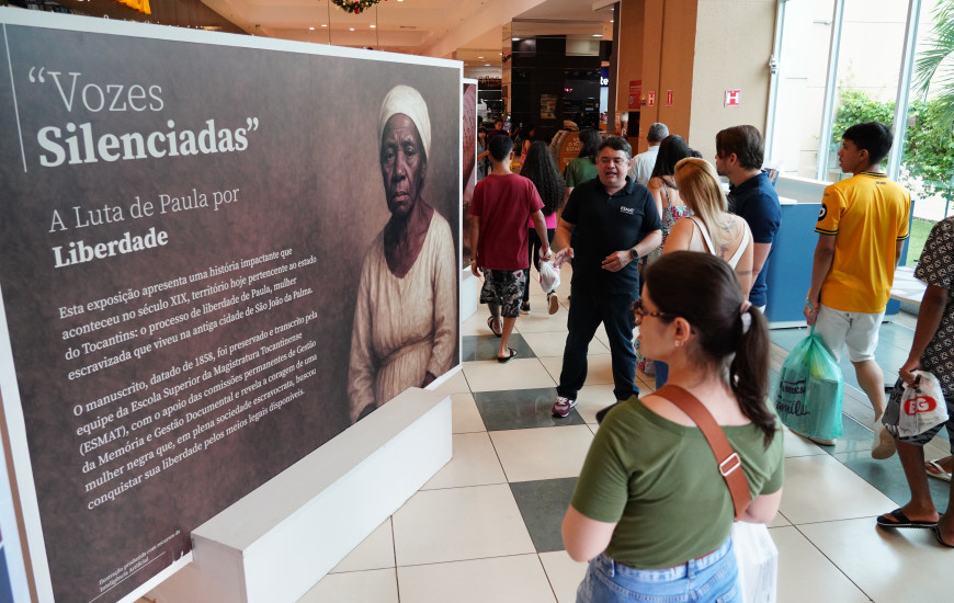 No meio do movimento apressado do Shopping Capim Dourado, em Palmas, uma ilha instalada em um dos corredores do centro comercial faz quem passa diminuir o passo. Diante dos painéis que contam a história de Paula, mulher negra que, em 1858, conquistou judicialmente a própria liberdade, visitantes se aproximam como quem encontra algo curioso.
