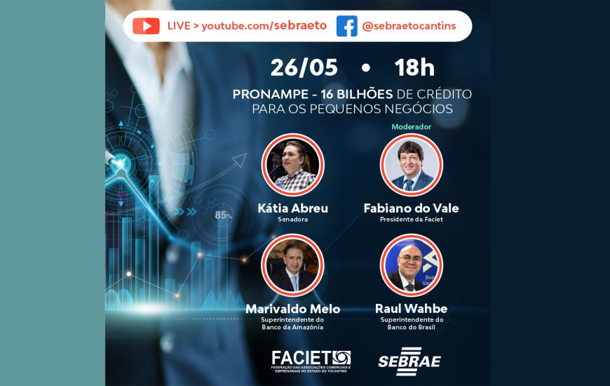 Nesta terça-feira, 26, o Programa Nacional de Apoio às Microempresas e Empresas de Pequeno Porte (Pronampe) voltará a ser discutido em uma transmissão ao vivo, a partir das 18 horas, no Facebook e YouTube do Sebrae Tocantins.