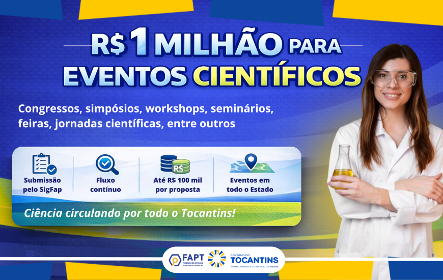 O Governo do Tocantins, por meio da Fundação de Amparo à Pesquisa do Tocantins (Fapt), publicou o Edital nº 01/2026, que vai apoiar financeiramente a realização de eventos técnico-científicos no estado ao longo de todo o ano de 2026. A chamada, em fluxo contínuo, destina R$ 1 milhão para viabilizar congressos, simpósios, workshops, seminários, feiras, jornadas científicas e outras iniciativas voltadas à divulgação e ao fortalecimento da Ciência, Tecnologia e Inovação (CT&I).
