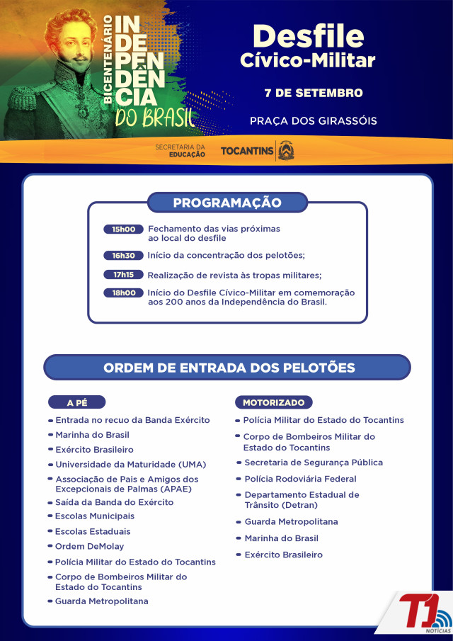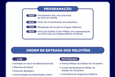 O bicentenário da Independência do Brasil será comemorado em Palmas com o retorno do tradicional Desfile Cívico-Militar, suspenso nos últimos dois anos, em virtude da pandemia. As atividades, coordenadas pela Secretaria de Estado da Educação (Seduc), ocorrerão no entorno da Praça dos Girassóis, nesta quarta-feira, 07, a partir das 18h, na Avenida LO-01 sentido Leste-Oeste.