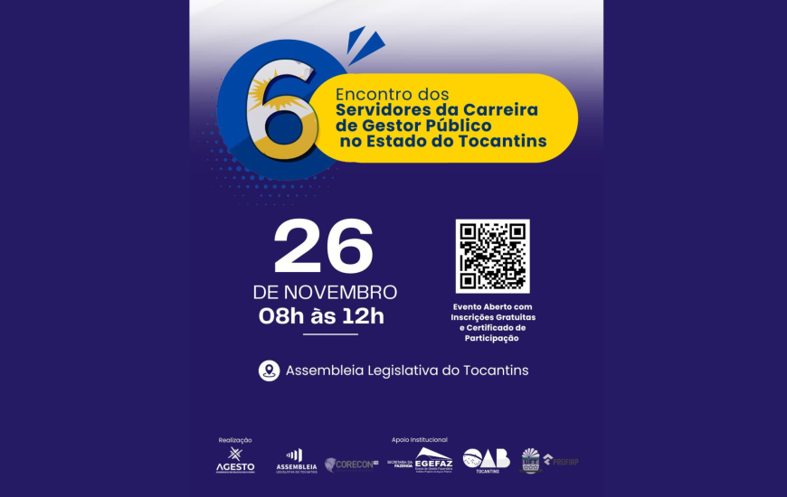 A Associação dos Gestores Públicos do Estado do Tocantins (Agesto) informou que a 6ª Edição do Encontro dos Servidores da Carreira de Gestor Público será realizada nesta quarta-feira, 26, às 8h, na Assembleia Legislativa. O evento será transmitido ao vivo pelo canal do órgão no YouTube. Clique aqui para se inscrever.