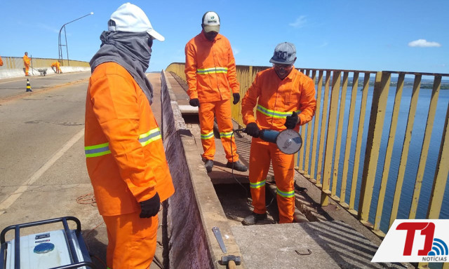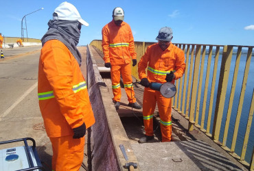 Os serviços de manutenção da ponte sobre o Rio Tocantins, na Rodovia TO-255, em Porto Nacional, foram iniciados pela remoção do concreto danificado nas pistas de rolamento (pavimento) nesta segunda-feira, 6. Uma segunda equipe também iniciou os trabalhos de reconstrução das tampas de concreto dos caixões, que também já passaram por limpeza interna. As passarelas de pedestre também estão recebendo novos blocos de concreto como piso.