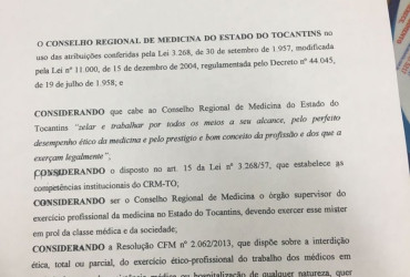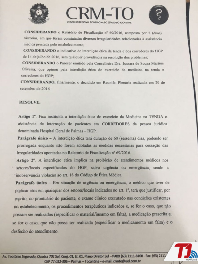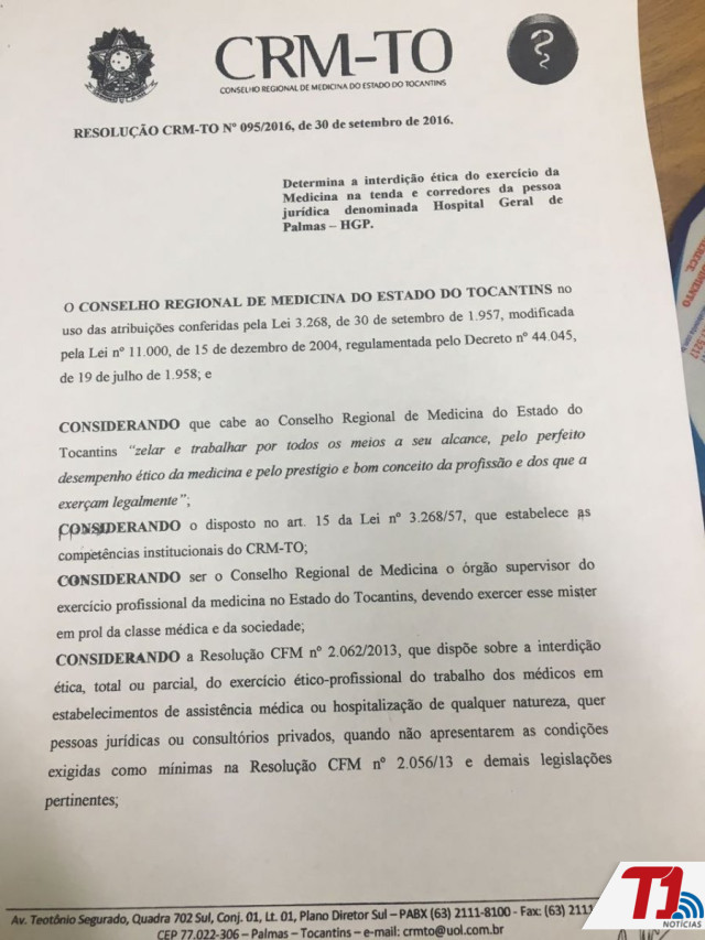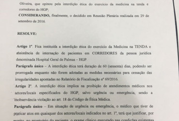 O maior hospital público do Tocantins enfrenta um dilema sobre a internação dos pacientes de alta e média complexidade. Isso porque o Conselho Regional de Medicina no Tocantins (CMR) publicou uma resolução com uma interdição ética, onde orienta a equipe médica do Hospital Geral de Palmas (HGP) a não efetuarem a internação de pacientes nos corredores e nos anexos (tendas) do hospital, alegando insalubridade.