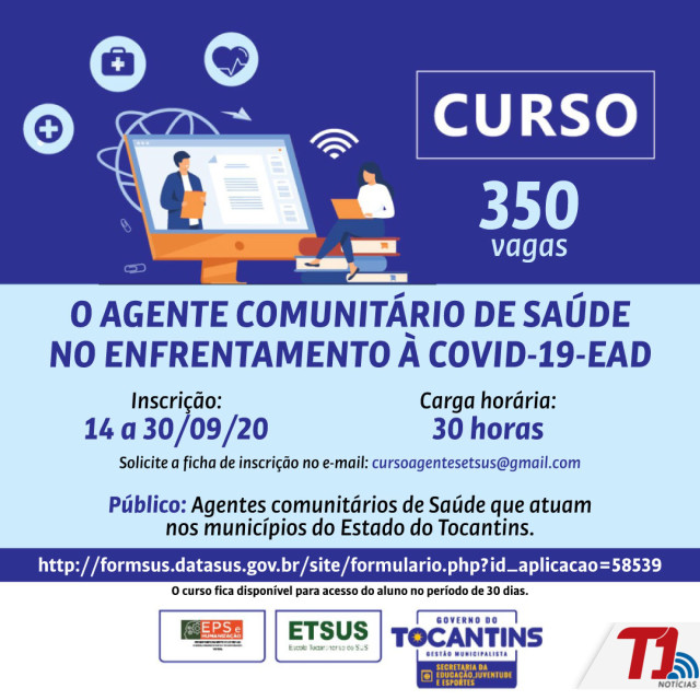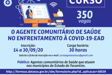 A Secretaria de Estado da Saúde (SES), por meio da Superintendência de Gestão Profissional e Educação na Saúde - Escola Tocantinense do SUS (ETSUS), está ofertando 350 vagas do curso “o Agente Comunitário de Saúde no enfrentamento à Covid-19”. O curso será ofertado na modalidade Educação à Distância (Ead), através da plataforma moodle da Escola Tocantinense do SUS (ETSUS).