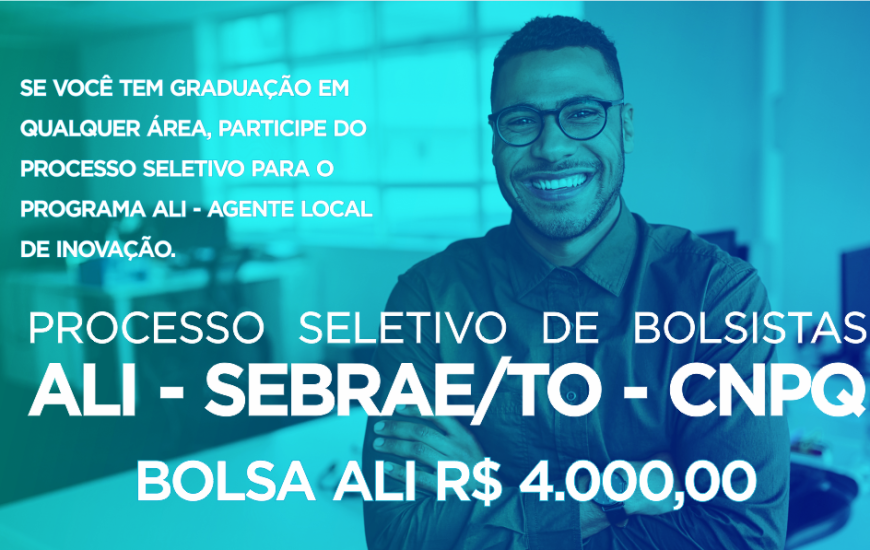 Os candidatos selecionados receberão bolsas de até R$ 4.000 reais. Iniciativa do Sebrae Tocantins e do Conselho Nacional de Desenvolvimento Científico e Tecnológico (CNPq). O projeto tem o objetivo de promover a melhoria da produtividade das empresas por meio de inovação e tecnologia.