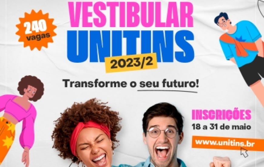 As inscrições para o vestibular 2023/2 da Universidade Estadual do Tocantins (Unitins) já estão abertas e, de acordo com o cronograma do edital publicado no dia 16, seguem até o dia 31 de maio. Ao todo, são ofertadas 240 vagas distribuídas entre os cursos de Direito, Engenharia Agronômica, Pedagogia, Serviço Social e Sistemas de Informação no Câmpus Palmas e Direito, no Câmpus Paraíso.