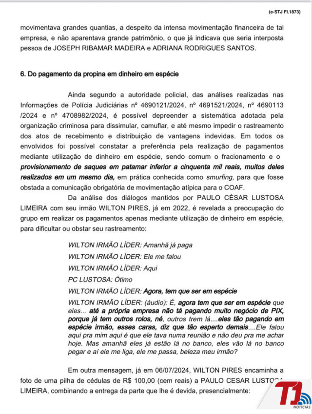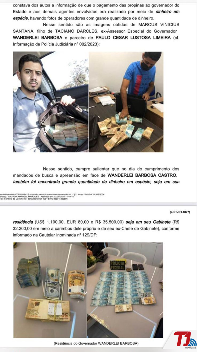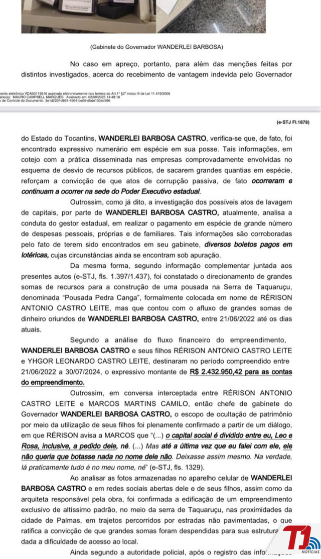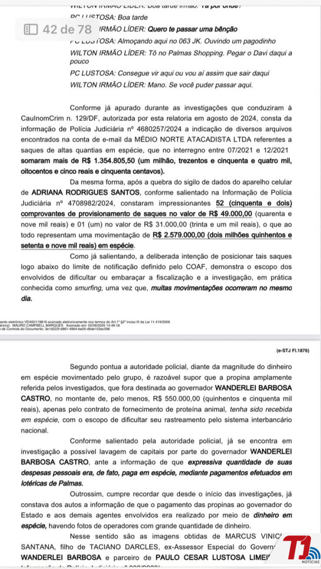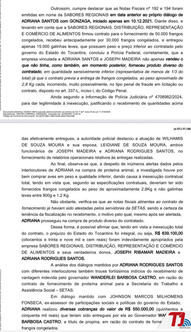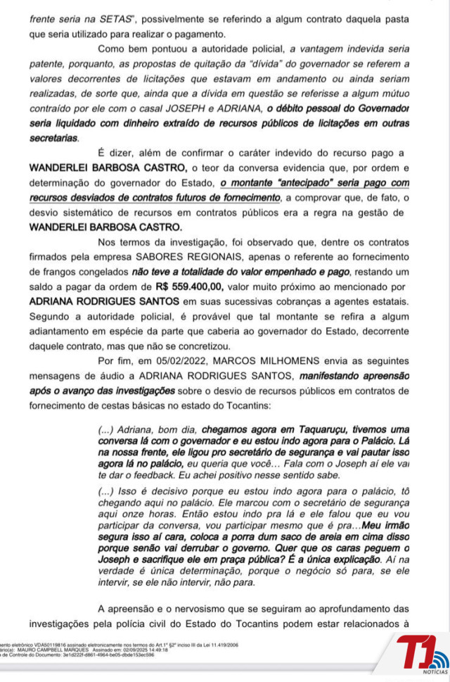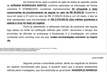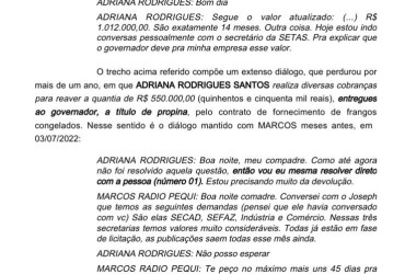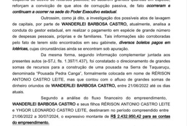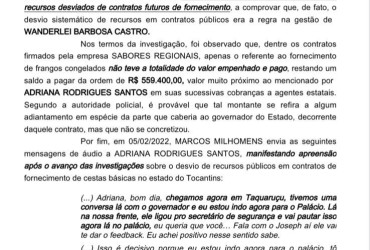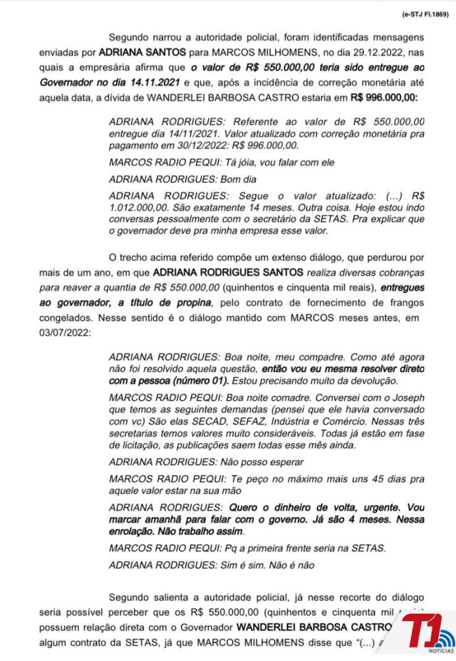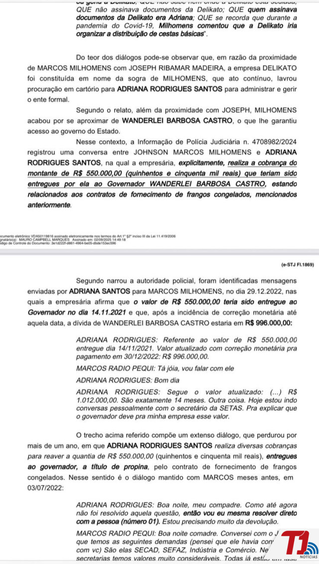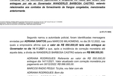Além disso, a decisão destaca diálogos mantidos por Adriana com diferentes interlocutores, que, segundo o relatório, teriam trazido “fortíssimos indícios do recebimento de vantagem indevida pelo governador Wanderlei Barbosa Castro, em razão do contrato de fornecimento de proteína animal para a Secretaria do Trabalho e Assistência Social (Setas)”.