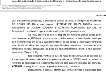Ainda segundo o documento, a empresa firmou contrato com a Setas para fornecer 50 mil frangos congelados por R$ 1,39 milhão, mas entregou apenas 15 mil unidades, e de qualidade inferior ao especificado. Apesar do pagamento antecipado de R$ 839 mil, o contrato não foi cumprido, configurando possível fraude à licitação, conforme o artigo 337-L do Código Penal.