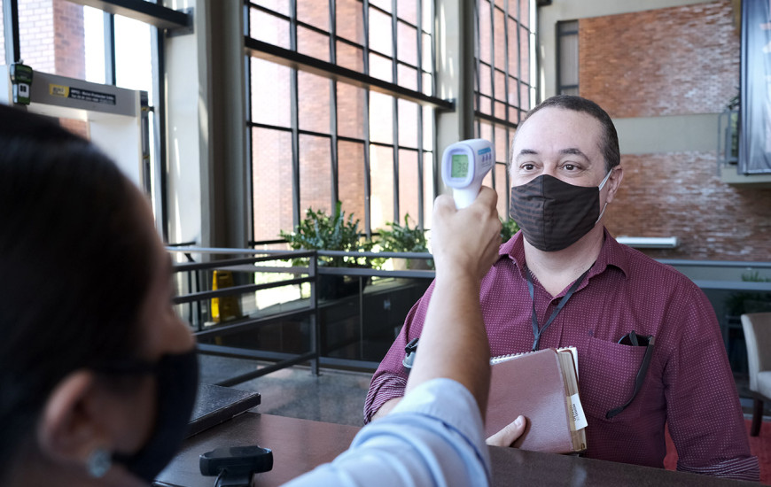 Com todos os prédios do Poder Judiciário passando por sanitização dos seus espaços, os servidores receberam quatro máscaras cada um e tiveram que medir a temperatura, através de termômetro digital ao entrar na sede do TJTO e das Comarcas.