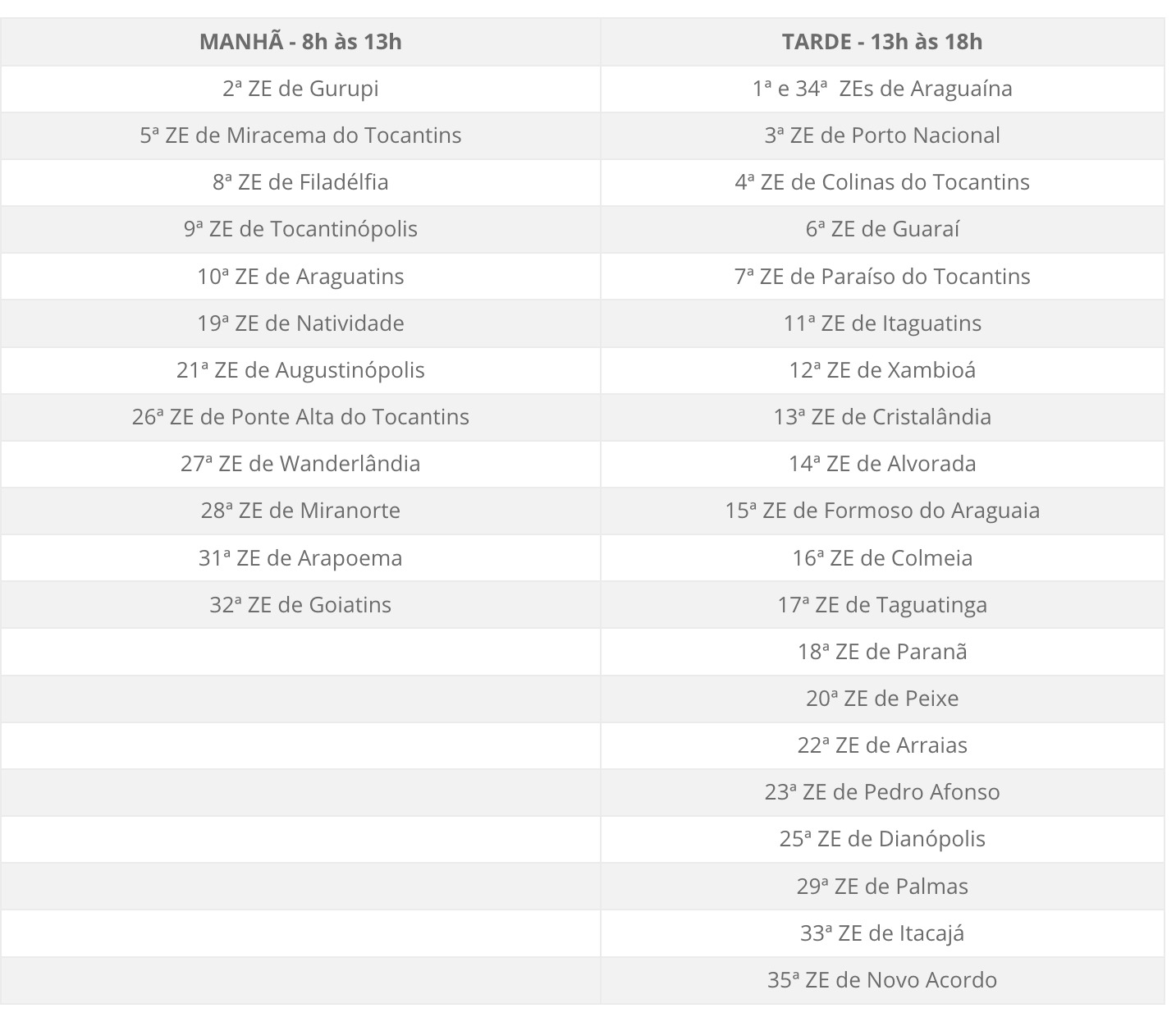 Na sede do Tribunal Regional Eleitoral (TRE-TO) e em 21 cartórios eleitorais, o atendimento ao público ocorrerá das 13h às 18h. Já os 12 cartórios que tradicionalmente funcionam no turno matutino terão expediente das 8h às 13h.