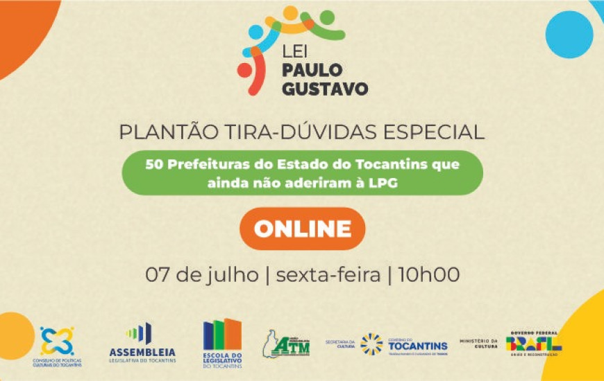 O Ministério da Cultura (MinC), através do Escritório Regional do Tocantins, em parceria com a Secretaria da Cultura (Secult), Associação Tocantinense dos Municípios e Assembleia Legislativa, realiza plantão tira-dúvidas para os gestores culturais nesta sexta-feira, 7, às 10 horas, na plataforma online Teams. A iniciativa é direcionada às prefeituras tocantinenses que ainda não aderiram à Lei Paulo Gustavo.