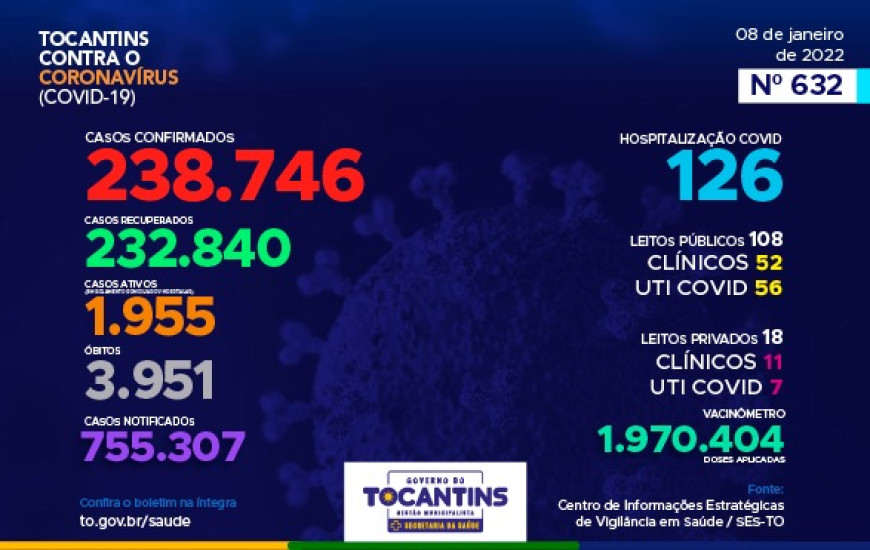 O boletim epidemiológico nº 632 informa que 126 pessoas estão hospitalizadas no Tocantins. Deste total, 108 estão em leitos públicos, sendo 52 em leitos clínicos e outros 56 em UTIs Covid. Já nos leitos privados, são 11 em clínicos e 7 em UTIs Covid, totalizando 18.