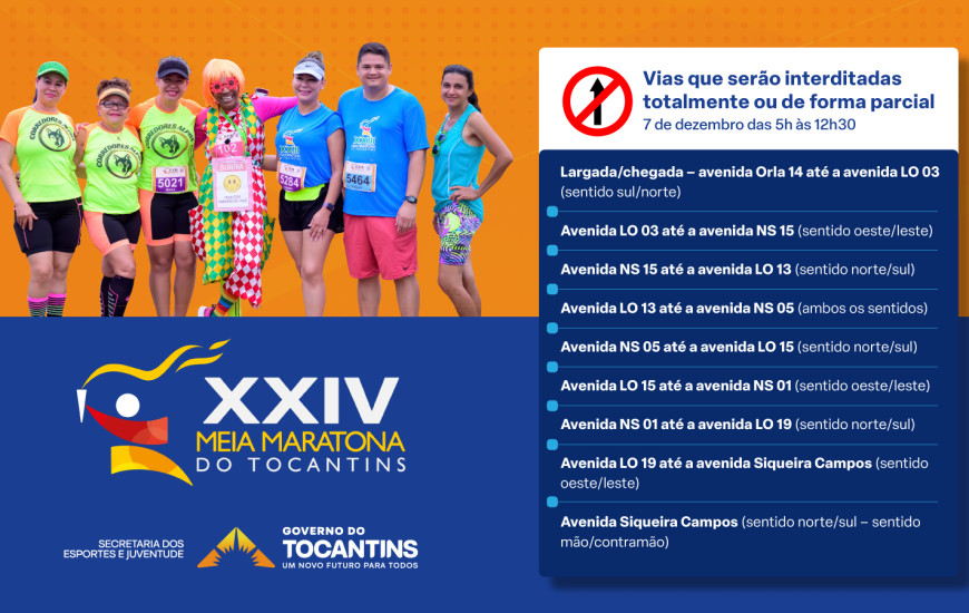 A Secretaria de Estado dos Esportes e Juventude (Seju) informou que por conta da 24ª Meia Maratona do Tocantins, que ocorrerá neste domingo, 7, as avenidas no entorno da Praia da Graciosa e parte da Av. Siqueira Campos serão interditadas de forma parcial ou total, das 5h às 12h30. A medida, de acordo com a gestão estadual, é para garantir a segurança dos competidores. A recomendação é de que a população fique atenta e busque avenidas alternativas, caso necessite passar pelo trecho.