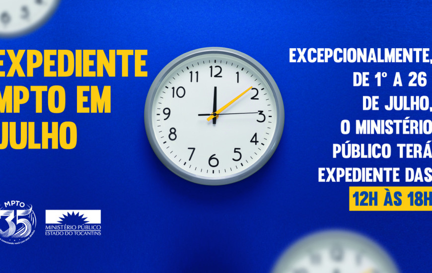 Em atendimento à solicitação da Associação dos Servidores Administrativos do Ministério Público (Asamp) à Procuradoria-Geral de Justiça, o MInistério Público do Tocantins adota em julho horário especial. O ato foi publicado no Diário Oficial de quinta-feira, 27 de junho pela Procuradoria-Geral de Justiça, que estabelece expediente especial das 12 às 18 horas no período de 1º a 26 de julho.