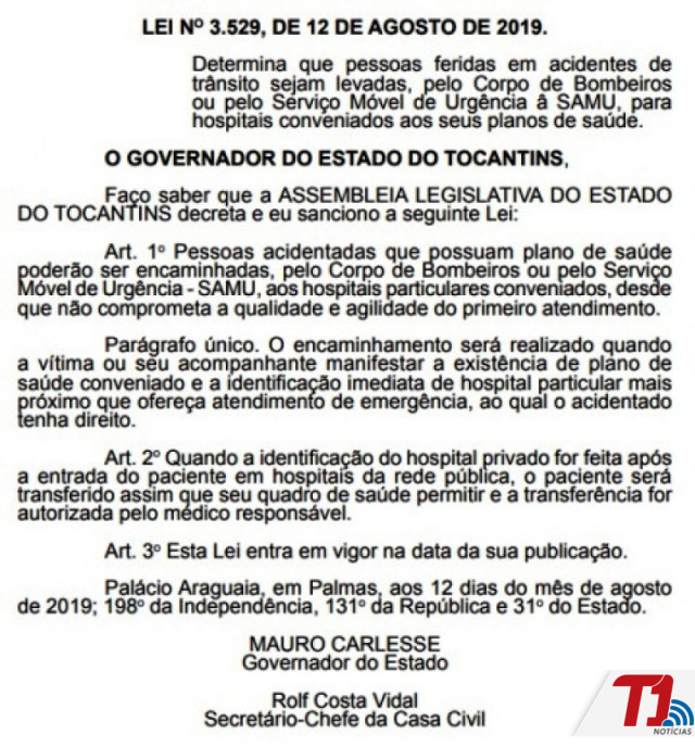 Sancionada e publicada no Diário Oficial do Estado nesta segunda-feira, 12, lei que determina que pessoas feridas em acidentes de trânsito podem ser levadas pelo Samu ou Corpo de Bombeiros diretamente para hospitais particulares conveniados aos seus planos de saúde, desde que não comprometa a qualidade e agilidade do primeiro atendimento.