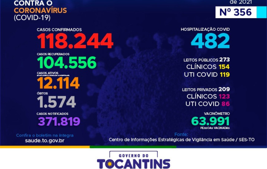 Atualmente, o Tocantins contabiliza 371.819 pessoas notificadas com a Covid-19 e acumula 118.244 casos confirmados. Destes, 104.556 pacientes estão recuperados, 12.114 pacientes seguem em isolamento domiciliar ou hospitalar e 1.574 pacientes foram a óbito.