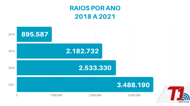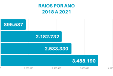 O Tocantins registrou quase 3,5 milhões de raios no ano passado. O aumento foi de 37,69% em relação a 2020, o que significa 954.860 descargas atmosféricas a mais. Os dados são do Instituto Nacional de Pesquisas Espaciais (Inpe), em parceria com a Energisa, que realiza o monitoramento em tempo real.