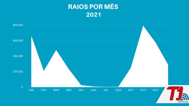 O mês de outubro foi o campeão de raios: 788 mil. Esse é o maior volume registrado em um único mês nos últimos quatro anos. O dia 23 de setembro também registrou uma marca impactante: 73.362 raios em 24 horas.