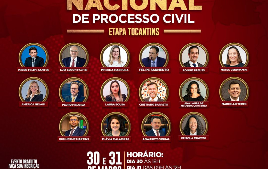 A Ordem dos Advogados do Brasil – Seccional Tocantins realiza nesta quinta e sexta-feira (30 e 31 de março) o maior evento jurídico do Estado. É o Circuito Nacional de Processo Civil, que chega ao Tocantins com inúmeros palestrantes de peso, entre eles, o ministro do Supremo Tribunal Federal (STF), Edson Fachin, que falará sobre jurisdição constitucional, precedentes e segurança jurídica.