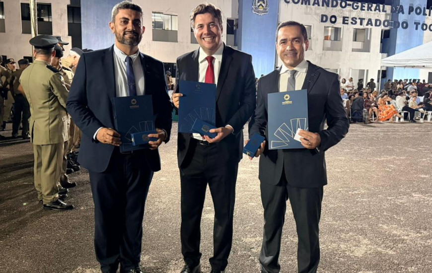O presidente da Ordem dos Advogados do Brasil – Seccional Tocantins, Gedeon Pitaluga Júnior, o conselheiro federal da OAB, José Pinto Quezado, e o presidente da Subseção de Araguaína, Davi Moraes, foram homenageados com a Medalha Tiradentes, a mais alta honraria concedida pela Polícia Militar do Tocantins, na última terça-feira, 31.