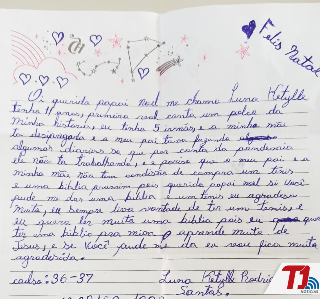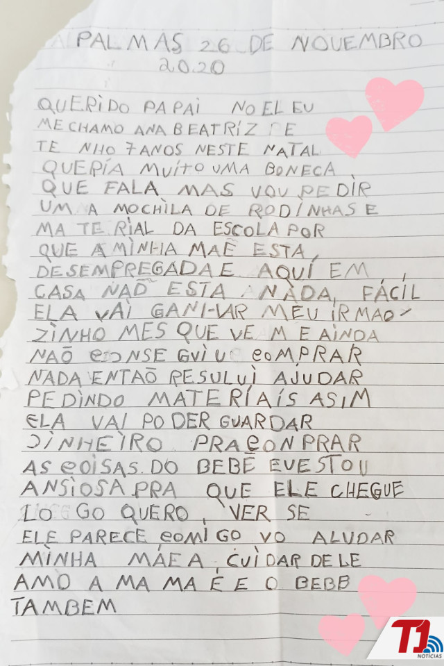 Os Correios já receberam cerca de 3 mil cartinhas de crianças de todos os cantos do Tocantins. Até o momento, 2.010 foram selecionadas e disponibilizadas para adoção, pois atendem aos critérios da Campanha, todavia somente 791 cartinhas foram adotadas. Os pedidos das crianças são dos mais variados: boneca, carrinho, bicicleta e até material escolar.