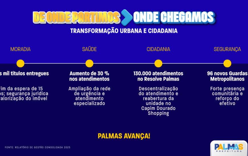 Em 2025, a gestão do prefeito Eduardo Siqueira Campos reforçou a atuação preventiva com a nomeação de 96 novos guardas metropolitanos. Somente no mês de julho, a Guarda Metropolitana de Palmas realizou mais de 1.600 atendimentos em diferentes regiões da Capital, além da ampliação de projetos de capacitação, ações educativas em escolas e cooperação com forças de segurança.