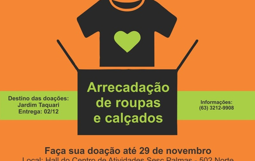 Com a preocupação na sustentabilidade social, o Programa Ecos, do Sesc Tocantins, realizará a campanha de arrecadação de roupas e calçados que serão destinados à comunidade do setor Jardim Taquari, em Palmas. A campanha estará aberta até o dia 29 de novembro em horário comercial no hall do Centro de Atividades de Palmas, que fica na 502 Norte. A entrega do material a ser arrecadado será feita no dia 02 de dezembro em horário e local a serem definidos.