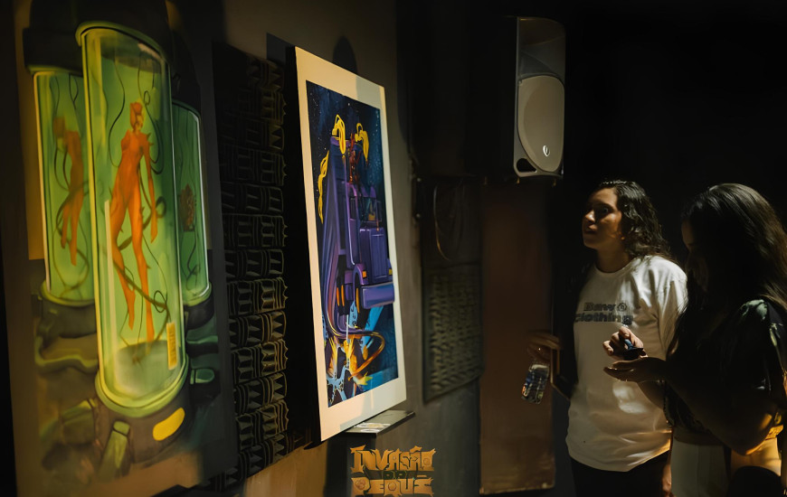 As obras recebem os mesmos nomes das faixas do álbum e resultam de um exercício de troca criativa, ressignificação e diálogo entre linguagens artísticas. A exposição reúne telas como Invasão do Pequi 2, Pseudo Caos, Celestina, Queen of Hell, Pequena Chance, Mammoth e Paz e Guerra, que seguem disponíveis para visitação pública no espaço.