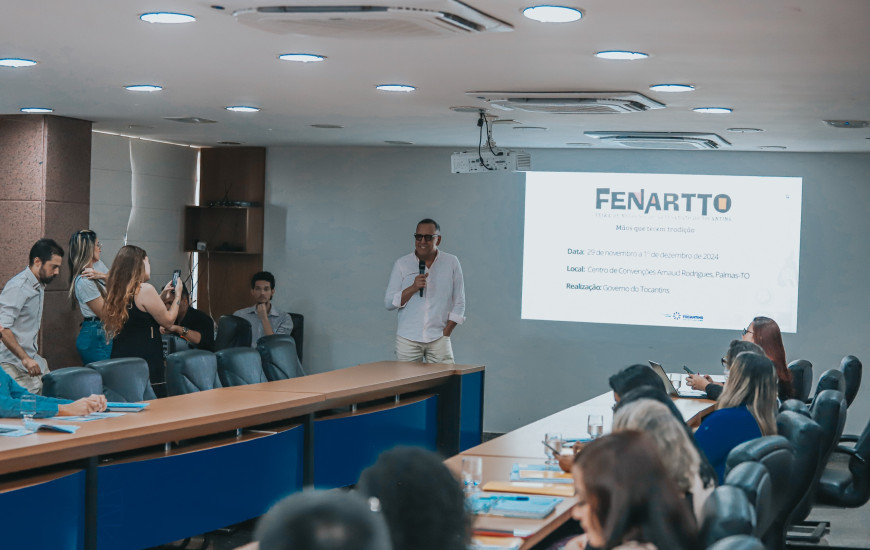 Em uma reunião convocada pela primeira-dama e secretária Extraordinária de Participações Sociais, Karynne Sotero, o secretário da Cultura, Tião Pinheiro, acompanhado da secretária-executiva Valéria Kurovski, do superintendente de Fomento e incentivo à Cultura Antonio Miranda, da assessora institucional Aurielly Painkow e servidores da Secult que atuam no desenvolvimento da feira, apresentou a representantes de várias pastas do Governo do Estado o projeto da I Feira de Negócios do Artesanato do Tocantins (Fenartto). O encontro aconteceu na sala de reuniões do Palácio Araguaia Governador José Wilson Siqueira Campos nesta terça-feira, 20, e teve o intuito de reunir gestores governamentais para conhecerem o planejamento do evento e alinharem possíveis parcerias. Com o tema "Mãos que tecem tradição", a Fenartto acontecerá entre os dias 29 de novembro e 1º de dezembro, no Centro de Convenções Arnaud Rodrigues, em Palmas, e terá como foco a exposição e comercialização do artesanato local.