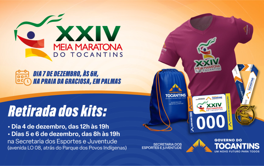 A retirada dos kits para a 24ª Meia Maratona do Tocantins começa nesta quinta-feira, 4, marcando a contagem regressiva para a prova que será realizada no próximo dia 7, às 6h, na Praia da Graciosa, em Palmas. Os atletas poderão buscar o material, que inclui número de peito, chip de cronometragem, camiseta e sacochila, na Secretaria dos Esportes e Juventude, com atendimento estendido até o dia 6.