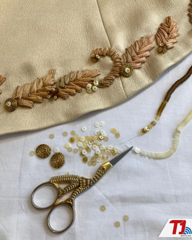 As peças em Capim Dourado foram confeccionadas pela artesã Eliene Bispo, presidente da Associação Dianapolina de Artesãs (ADA). A escolha do artesanato dianopolino é mais um reconhecimento para a artesã que com auxílio da Sectur, participa de diversas feiras nacionais e internacionais de artesanato. Para a roupa da primeira-dama foram confeccionadas cerca de 180 minis mandalas de Capim Dourado de 1,5 a 2 cm. O convite para colaborar com produção da roupa veio da estilista responsável pela criação da mesma, Helô Rocha.