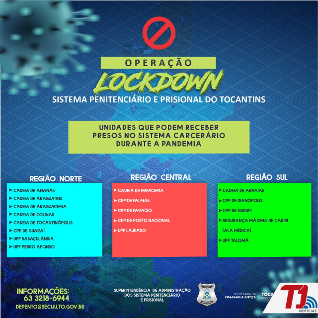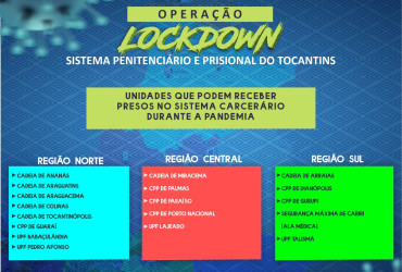 A Secretaria de Estado da Cidadania e Justiça (Seciju) informou nesta quarta-feira, 3, que vem realizando a Operação Lockdown, promovida pela Superintendência de Administração dos Sistemas Penitenciário e Prisional. A ação tem o objetivo de evitar a proliferação do novo coronavírus nos estabelecimentos penais do Estado do Tocantins, a partir da limitação do recebimento de novos presos em algumas unidades prisionais, e inicia sua segunda etapa selecionando novas unidades para receber presos durante a Pandemia da Covid-19.
