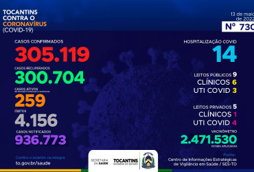 O boletim epidemiológico nº 730 informa que 14 pessoas estão hospitalizadas no Tocantins. Deste total, 9 estão em leitos públicos, sendo 6 em leitos clínicos e outros 3 em UTIs Covid. Já nos leitos privados, são 1 em clínicos e 4 em UTIs Covid, totalizando 5.