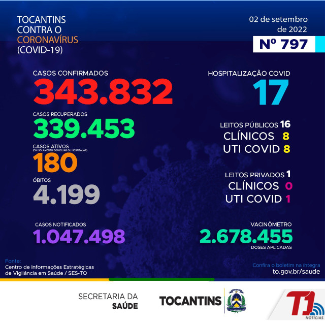 O boletim epidemiológico nº 797 informa que 17 pessoas estão hospitalizadas no Tocantins. Deste total, 16 estão em leitos públicos, sendo 8 em leitos clínicos e outros 8 em UTIs Covid. Já nos leitos privados, são 0 em clínicos e 1 em UTIs Covid.