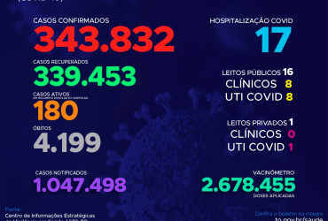 Com os novos dados, atualmente o Estado contabiliza 1.047.498 pessoas notificadas com a Covid-19 acumula 343.832 casos confirmados. Destes 339.453 estão recuperados, 180 pacientes seguem em isolamento domiciliar ou hospitalar e 4.199 foram a óbito.