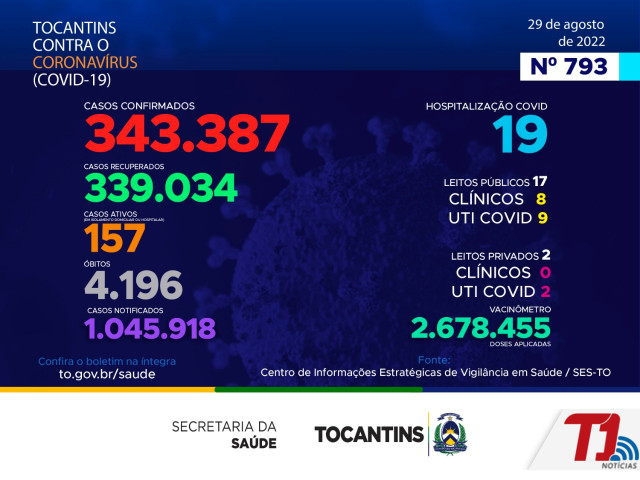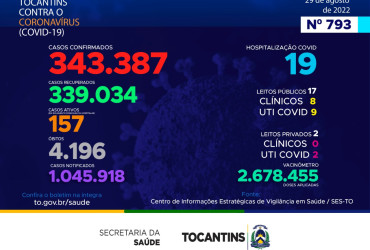 O boletim epidemiológico nº 793 informa que 19 pessoas estão hospitalizadas no Tocantins. Deste total, 17 estão em leitos públicos, sendo 8 em leitos clínicos e outros 9 em UTIs Covid. Já nos leitos privados, são 0 em clínicos e 2 em UTIs Covid.