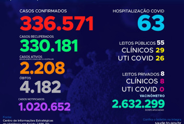 Com os novos dados, atualmente o Estado contabiliza 1.020.652 pessoas notificadas com a Covid-19 e acumula 336.571 casos confirmados. Destes 330.181 estão recuperados, 2.208 pacientes seguem em isolamento domiciliar ou hospitalar e 4.182 foram a óbito.