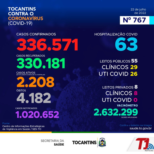 O boletim epidemiológico nº 767 informa que 63 pessoas estão hospitalizadas no Tocantins. Deste total, 55 estão em leitos públicos, sendo 29 em leitos clínicos e outros 26 em UTIs Covid. Já nos leitos privados, são 8 em clínicos e 0 em UTIs Covid, totalizando 8.