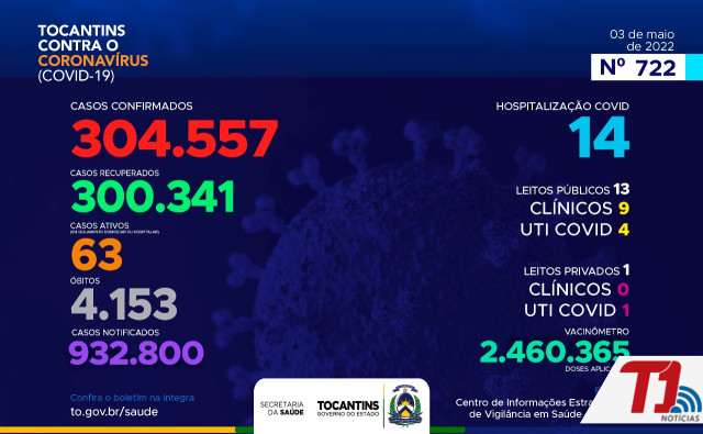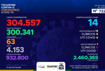 O boletim epidemiológico nº 722 informa que 14 pessoas estão hospitalizadas no Tocantins. Deste total, 13 estão em leitos públicos, sendo 9 em leitos clínicos e outros 4 em UTIs Covid. Já nos leitos privados, são 0 em clínicos e 1 em UTIs Covid, totalizando 1.