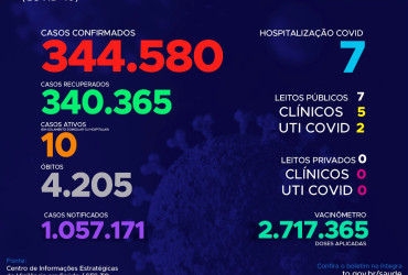 Com os novos dados, atualmente o Estado contabiliza 1.057.171 pessoas notificadas com a Covid-19 e acumula 344.580 casos confirmados. Destes, 340.365 estão recuperados,10 pacientes seguem em isolamento domiciliar ou hospitalar e 4.205 foram a óbito.